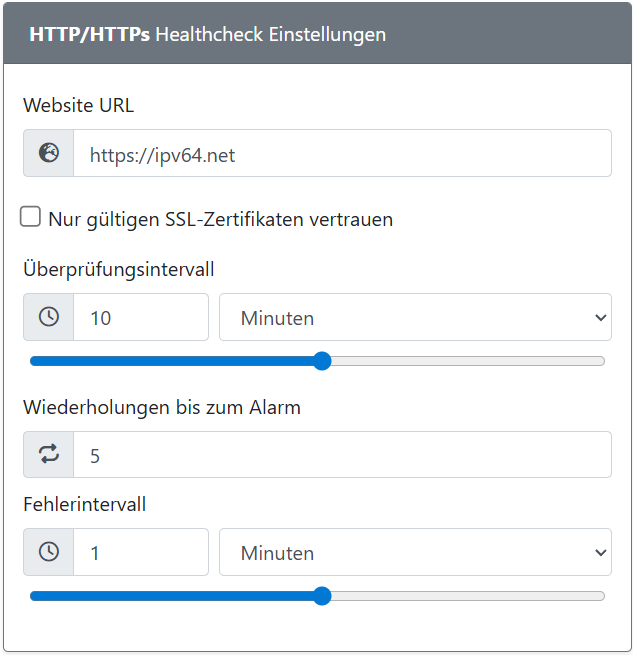 - Fehlerintervall: Definiere, wie oft der Healthcheck läuft, wenn der letzte Zustand „Offline“ war – z. B. weil die Website nicht erreichbar war oder das Zertifikat abgelaufen ist.